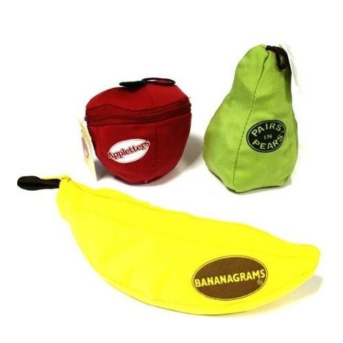 The fruit word game assortment includes Bananagrams, Appletters, and Pairs in Pears. Great word games for kids of all ages. * Appletters is a domino-like game for ages six and up where players connect letters instead of dots. * Banangrams is a scrabble-like game but without the board. Using a selection of 144 plastic letter tiles, each player works independently to create their own 'crossword'. When a player uses up all their letters, all players take a new tile from the pool. When all the tiles are gone, the first player to use up all the tiles in their hand wins. * Pairs in Pears is a portable, compact spelling game. Inside a pear-shaped pouch are letter tiles featuring various designs (dots, lines, blank and solid). A fun way for children to develop memory and cognitive skills while learning alphabetical order, word construction, consonants, and vowels, vocabulary, rhyming, etc.